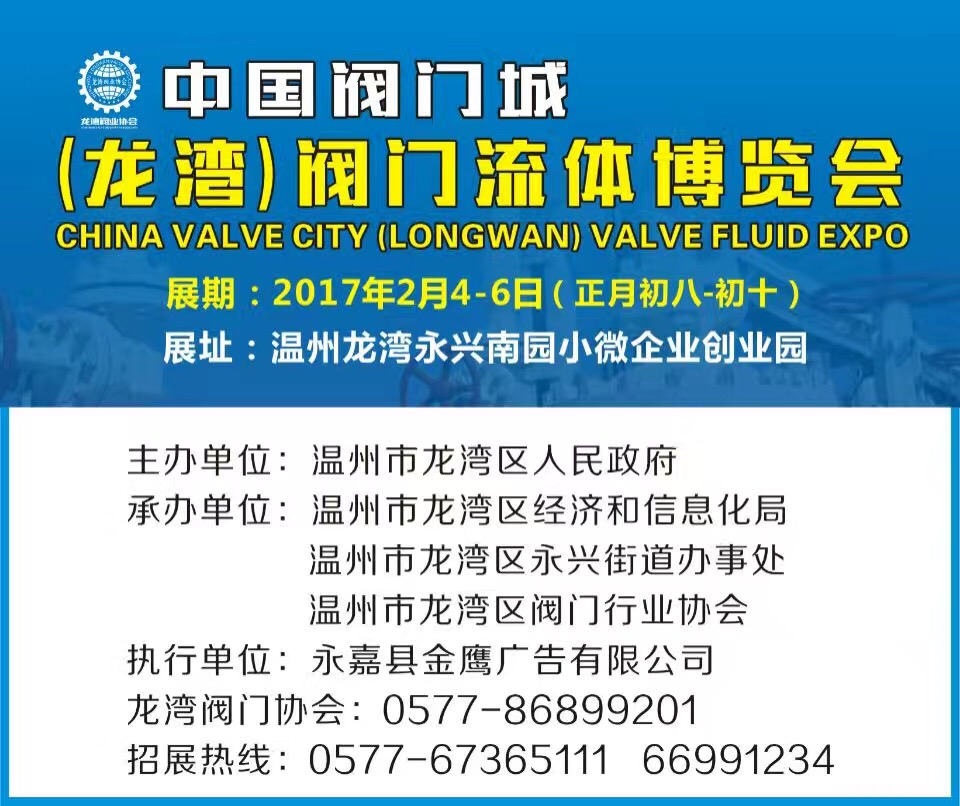 展期:2017年2月04-06日 展址:溫州龍灣永興南園小微企業創業園 主辦:溫州市龍灣區人民政府 承辦:溫州市龍灣區永興街道辦事處 溫州市龍灣區閥門行業協會 執行:永嘉縣金鷹廣...